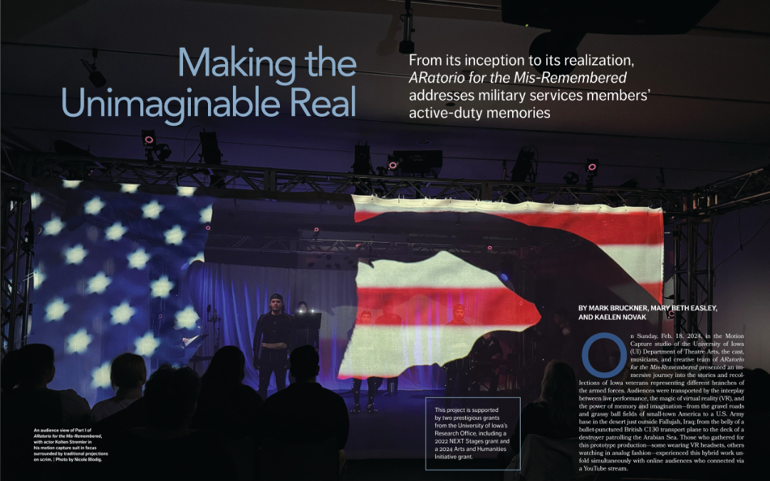 "I'd like to thank the USITT and TD&T Editorial Staff, the University of Iowa Department of Theatre Arts; The University of Iowa Office of Vice President for Research; and ret. Sgt, Matthew Miller, and the staff of the IVETS office at the University of Iowa.