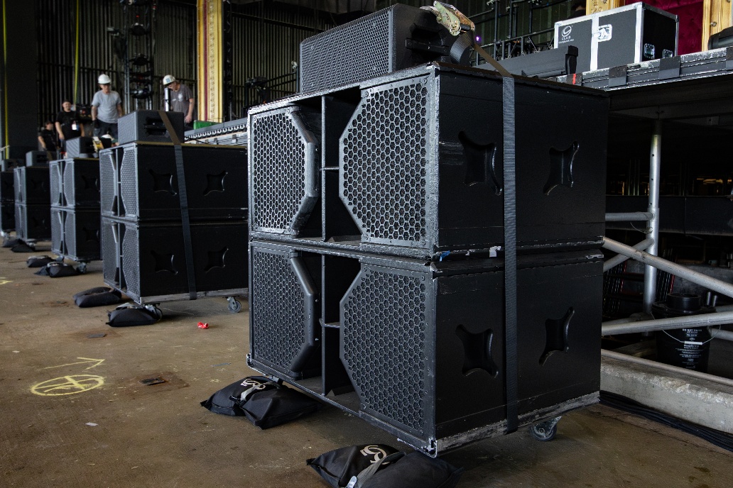 Nine Cohesion CP218 II+, described by System Engineer Mike Grabarczyk as “those absolute powerhouses,” were hung in cardioid configuration behind the mains, buffeted by six ground stacks of two CP218 II+. On top of each ground stack, one Cohesion CF28 fill speaker was strapped with an additional CF28 placed on the ends of the stage.